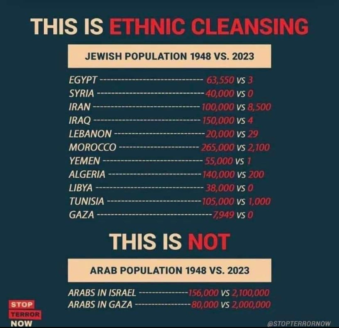 And over the subsequent decades, in a pattern which is the precise inverse of ethnic cleansing, that Arab population of 156,000 has swelled to 2,100,000, comprising a full 20% of Israel.