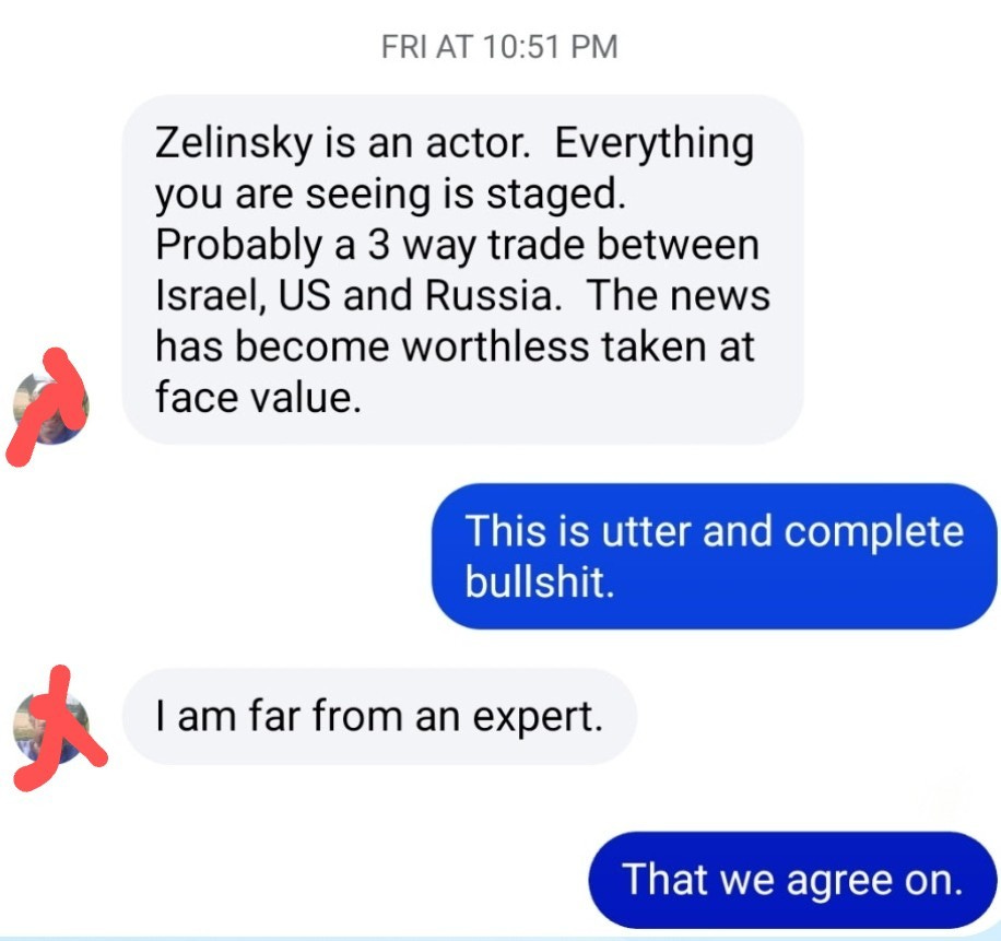 I posted several times last week about the Zelensky ambush, and a stranger showed up in my inbox with a tinfoil hat full of crazy. Here is the exchange we had:
